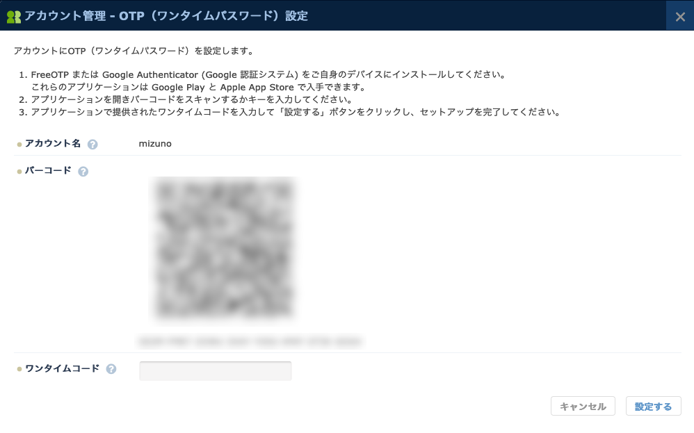 OTPを設定するダイアログが開きます。Google AuthenticatorやFreeOTPといったスマホアプリでQRコードを読み取って、OTPを設定してください。
