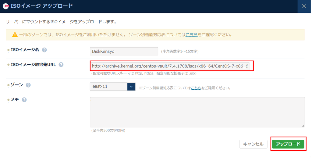 下記アーカイブURLを「ISOイメージ取得先URL」に直接入力して、アップロードします。
