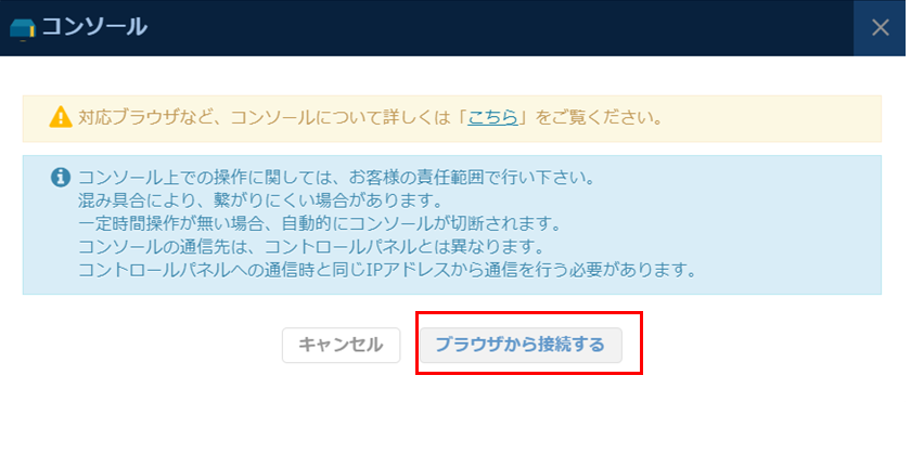 ダイアログが表示され「ブラウザから接続する」をクリックするとコンソールが起動されます。