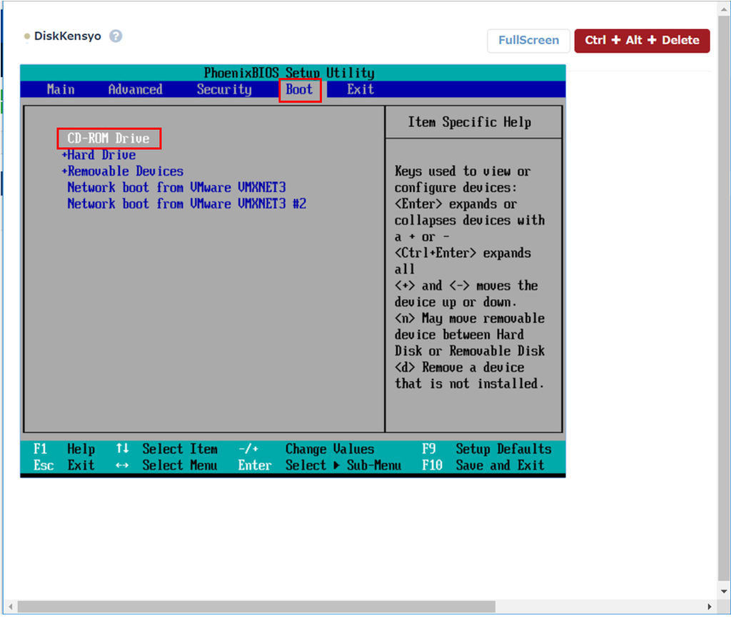 BIOSの起動画面が表示されるので「Boot」タブに移動し「CD-ROM Drive」を一番上に移動します。