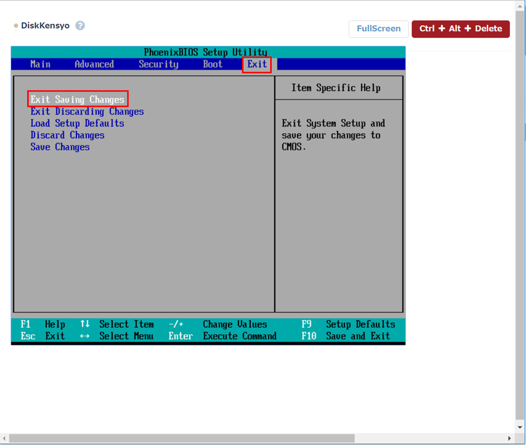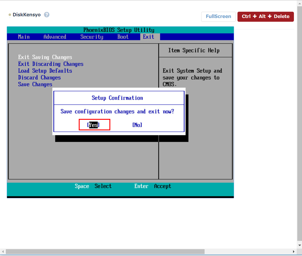 「Exit」タブに移動し「Exit Saving Changes」を選択し「Yes」をクリックします。