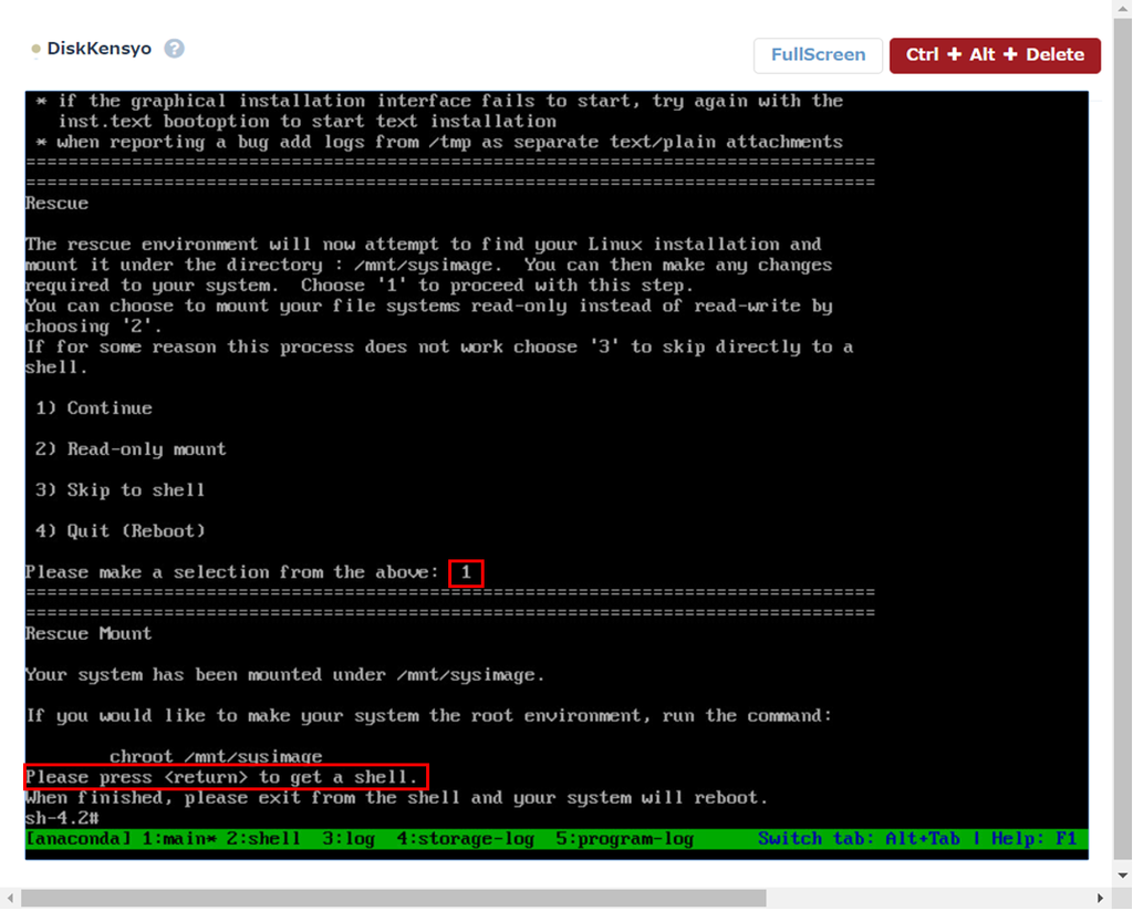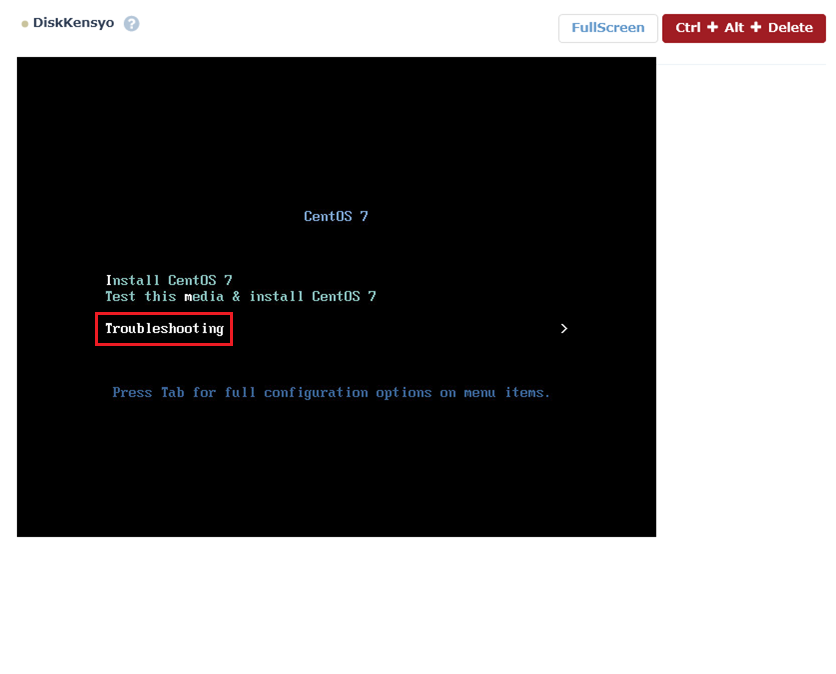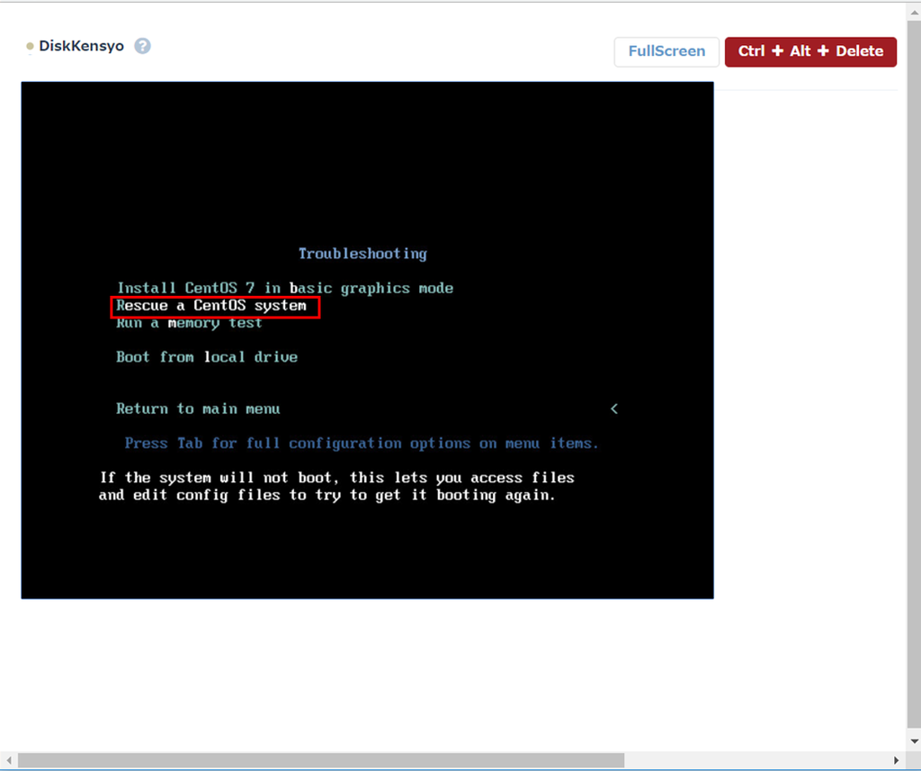 ISOインストールメディアが起動したら、「Troubleshooting」→「Rescue a CentOS system」を選択後、「1」を入力し「Please press \<return> to get a shell.」で止まるのでEnterキーを押下します。