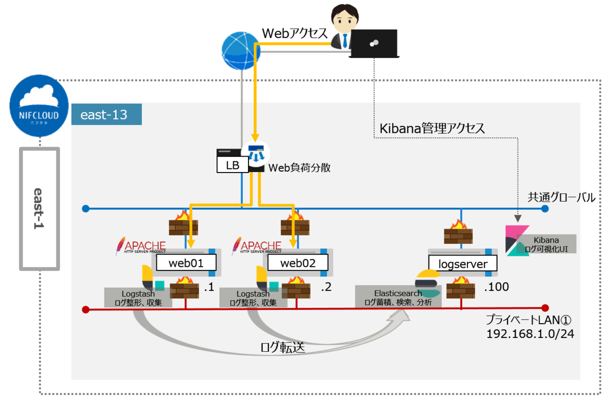 | web01 | ログ収集対象Webサーバー(アクセスログ出力・転送) | Logstash, Apache HTTP Server | 192.168.1.1 |