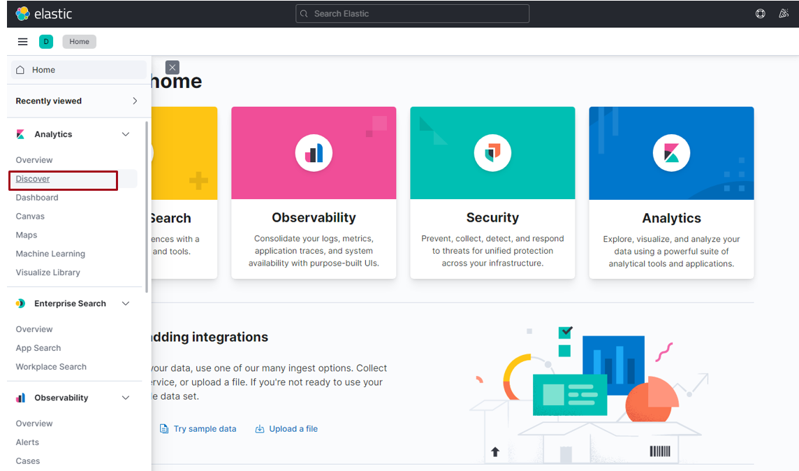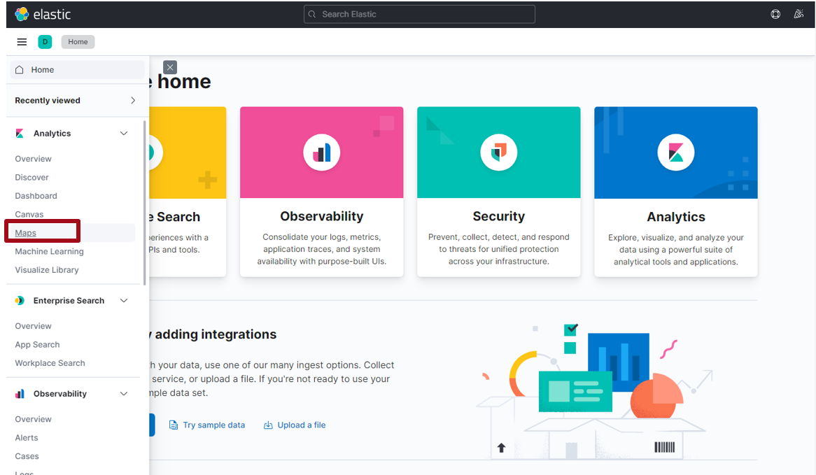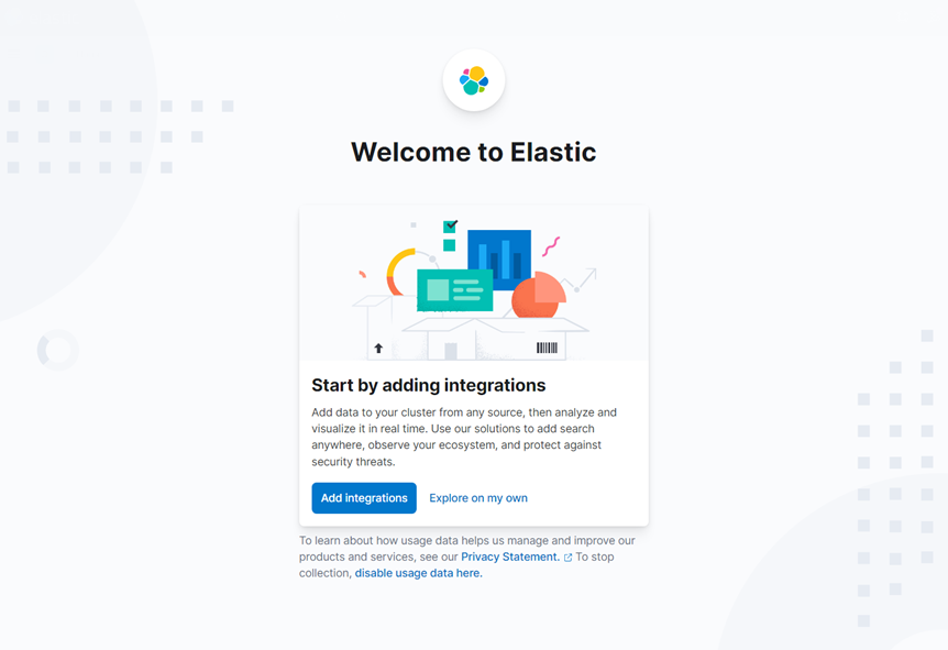 テスト端末から、Web ブラウザで Kibana のホームページにアクセスします。