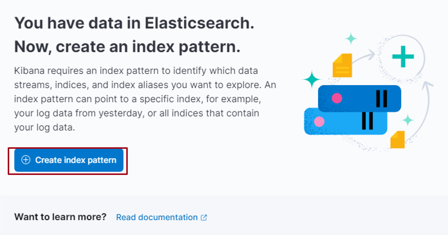 左サイドメニューの [Discover] を選択し、[Create index pattern] を押下します。(Elasticsearch のインデックスを識別するためのインデックスパターンを構成します。)