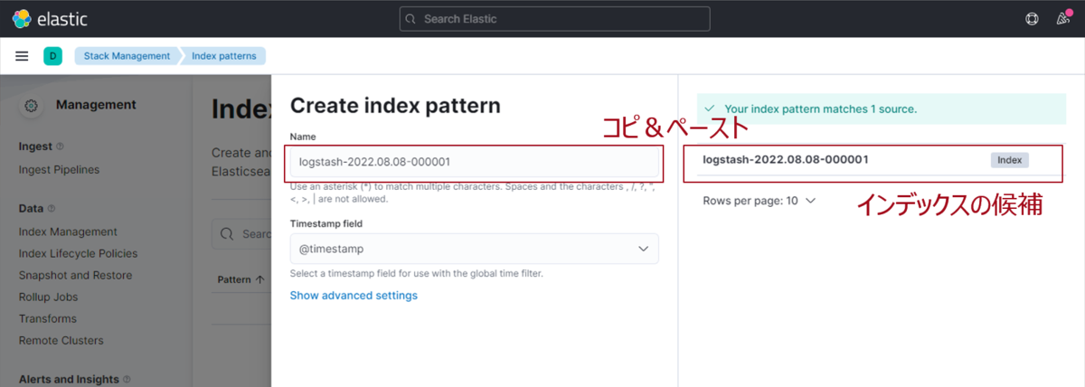 [Index pattern] より、今回作成したインデックスパターン名を選択します。