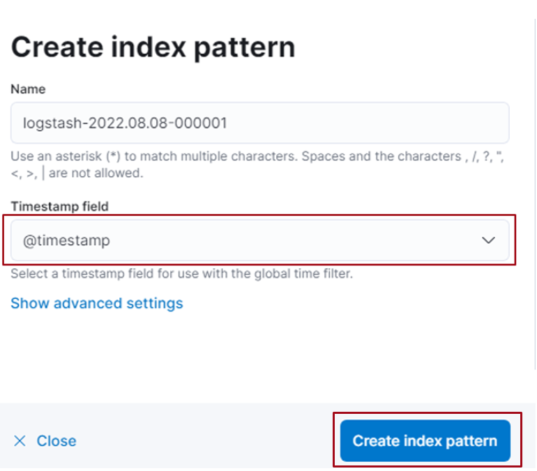 [Time field] から [@timestamp] を選択し、[Create index pattern] を押下します。