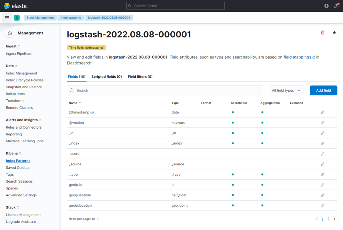 インデックスパターンのフィールドが一覧表示されることを確認します。