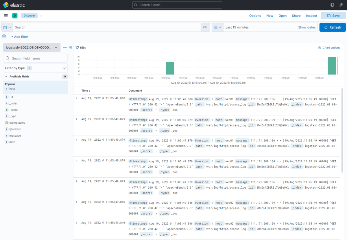 左サイドメニュー [Discover] をクリックして取得した時系列のログを確認します。(ログ可視化サーバー と 監視対象Webサーバー1,2のログが混在した状態で表示されます。)