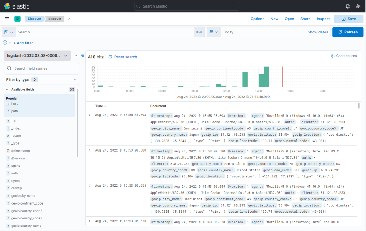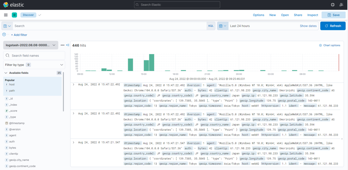 本来のアクセス元のIPが clientip として記録されています。また、先ほど追加したgeoipの情報が付加されていることが確認できます。