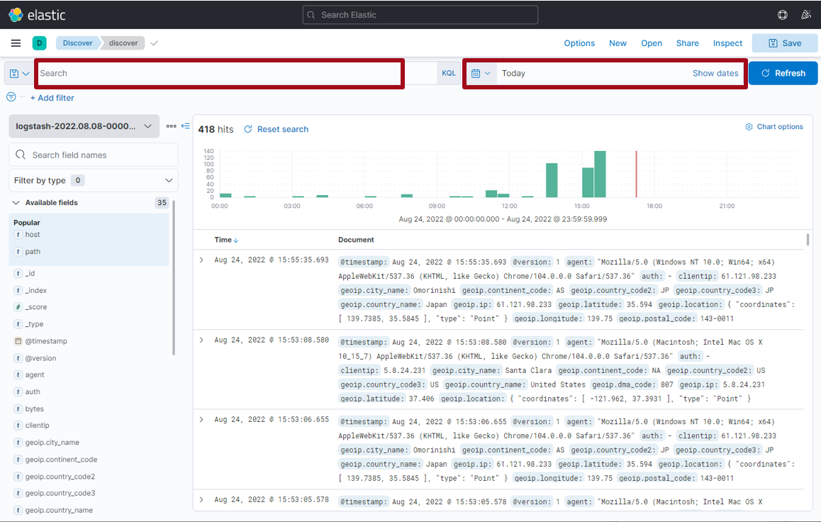 Search欄では、各フィールド属性を指定して、指定した値を含むログを検索できます。 また、対象となる日時の検索も可能です。