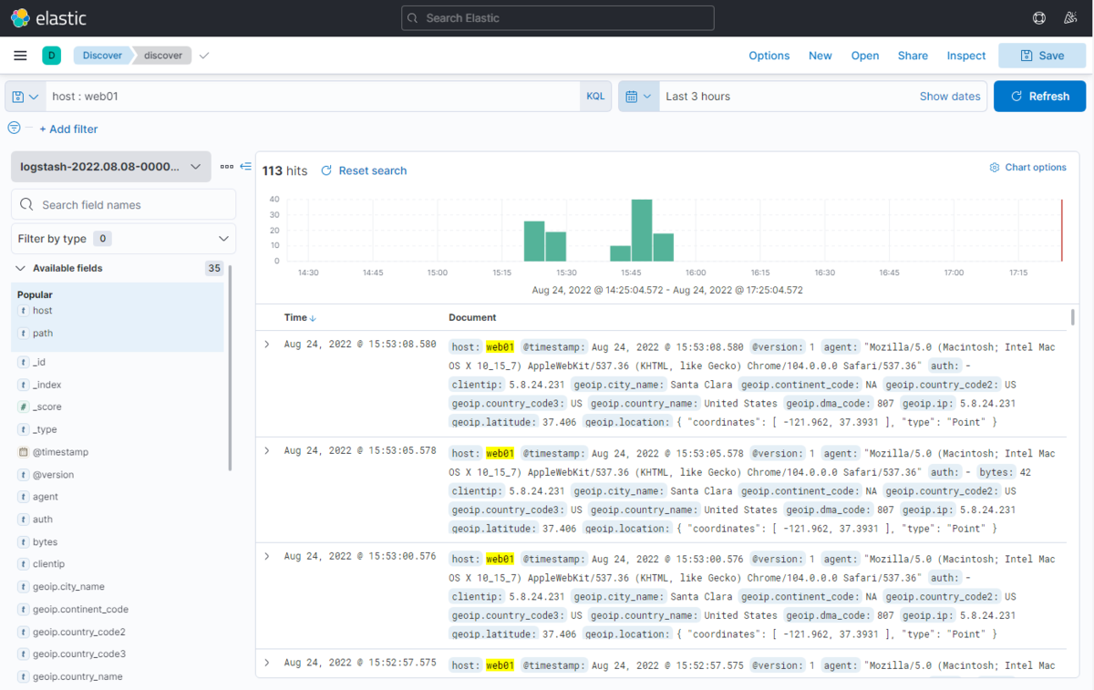 web01サーバーの過去3時間のログを絞り込んでみます。