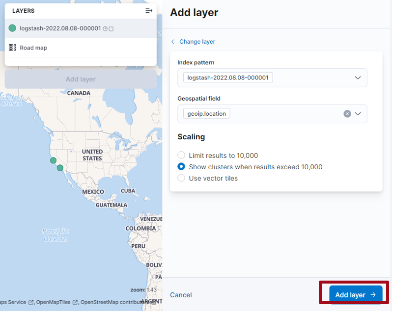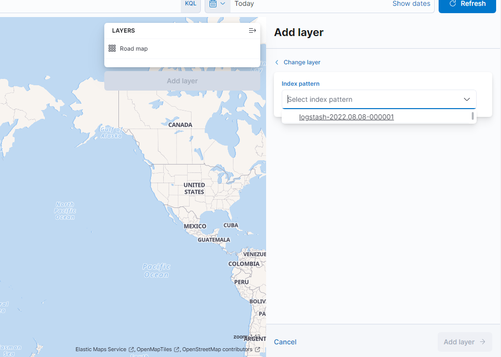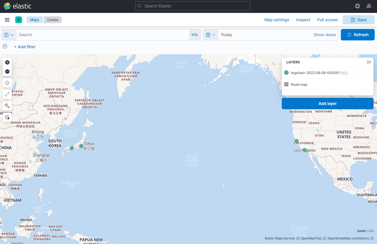 先ほど、Logstashの設定で geoip のフィルター条件を追加しました。Kibanaではマップ表示機能がありますので、アクセス元のIPをベースにマップ上での可視化を行ってみます。