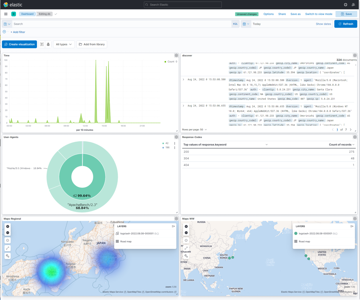 geoip によって、アクセス元のIPを位置判定した結果が表示されました。(今回 geoip のテスト用に、テスト端末のアクセス元を変更しています。) 他に Heatmap という機能もあり、意図しない利用者からのWebアクセスやサイバー攻撃を受けた際などには、どこからどれくらいのボリュームのアクセスがあるか、またはあったかを 把握できます。