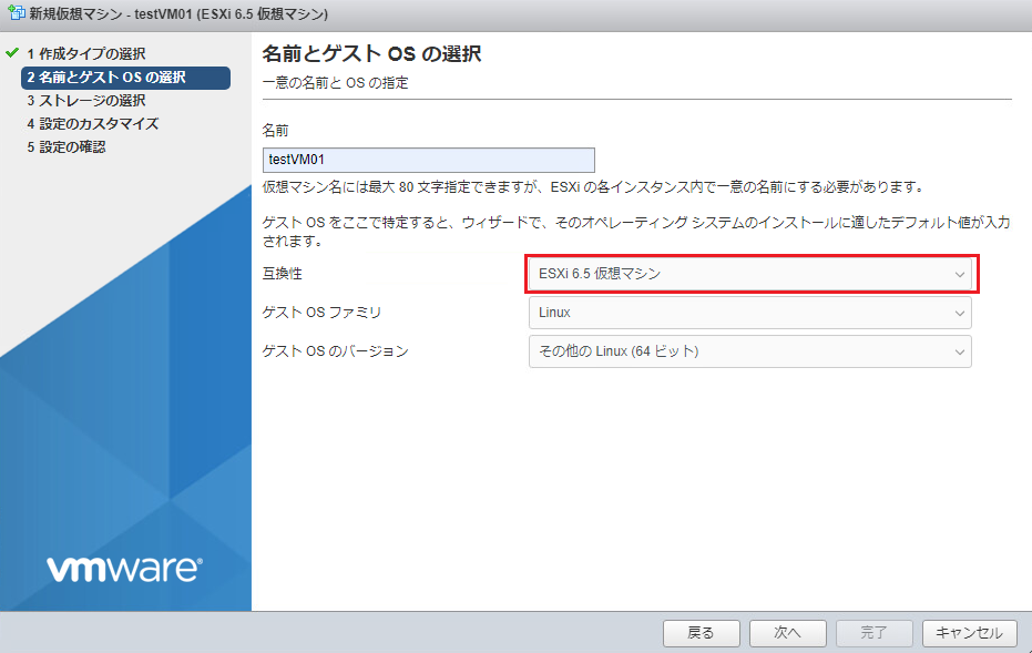 名前とゲストOSの選択画面では、互換性で「ESXi 6.5 仮想マシン」を選択します。