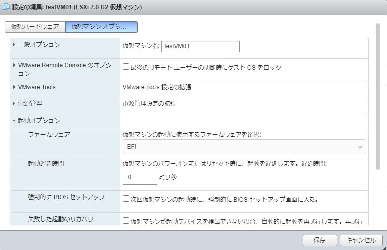 まずは仮想マシンオプションの画面を開いて、用意したディスクイメージに合ったファームウェアが正しく指定されていることを確認します。