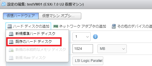 次に仮想ハードウェアの画面を開いて「ハードディスクの追加」から「既存のハードディスク」を選択します。