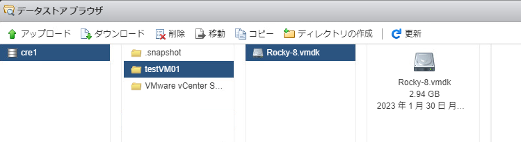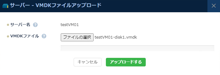 OVFファイルのインポートが完了した後で「testVM01-disk1.vmdk」をアップロードします。