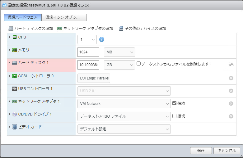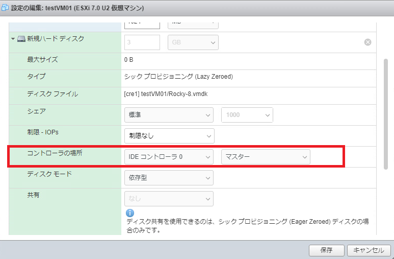 「仮想マシンtestVM01のパワーオンに失敗しました。「scsi0:0」用のディスクタイプ7がサポートされていないか無効です。ディスクがインポートされていることを確認してください。」