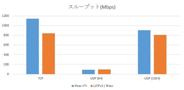 スループットについては IPsec VTI が L2TPv3 / IPsec と比較して TCPで300Mbps程度、UDP (送信パケットサイズ1024Byte)で100Mbps程度よい数値となりました。