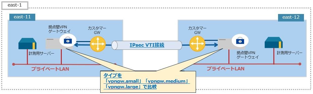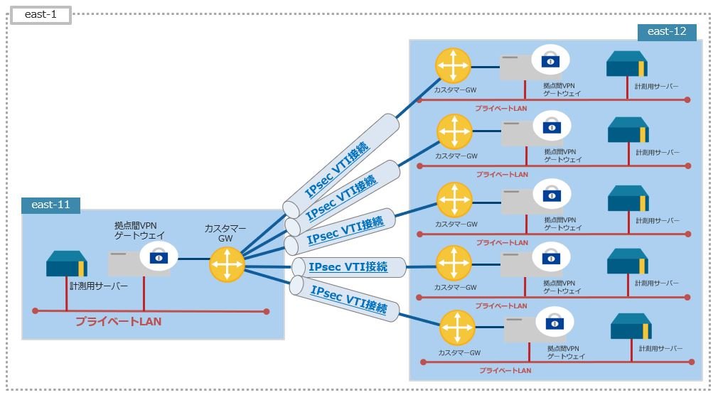 計測2の環境のeast-12ゾーンにプライベートLAN、拠点間VPNゲートウェイ、計測用サーバーを4つずつ追加して計測します。