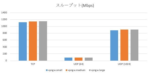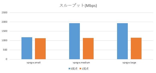 vpngw.medium、vpngw.largeは1拠点のときと比較して780~790Mbps程度スループットが高い結果となりました。