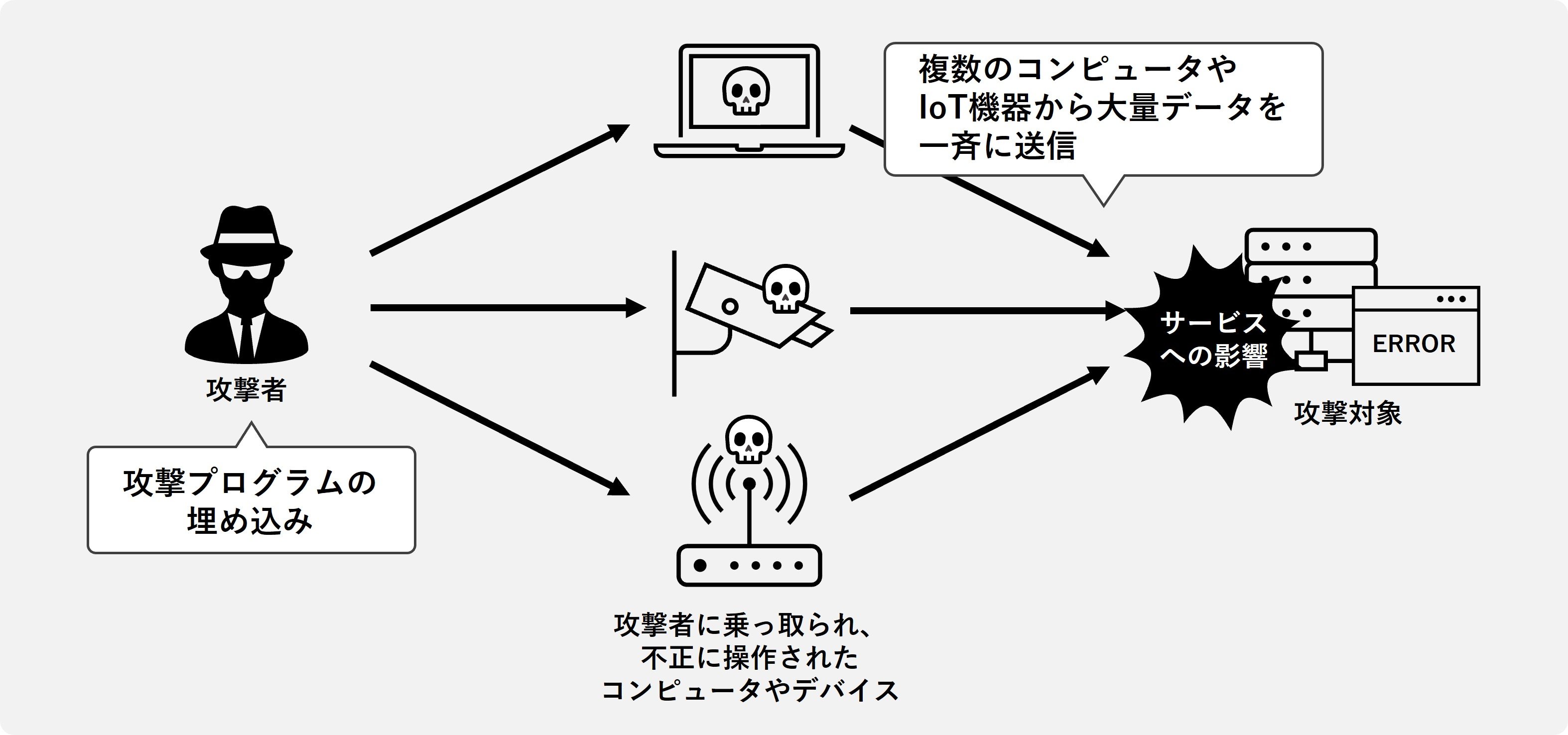 近年はPCのみならず、IoT機器を使用した大規模なボットネットが構築され、DDoS攻撃に利用されています。2016年には「Mirai」と呼ばれるマルウェアに感染したIoT機器によって構築されたボットネットからの大規模なDDoS攻撃の被害も観測されています。
