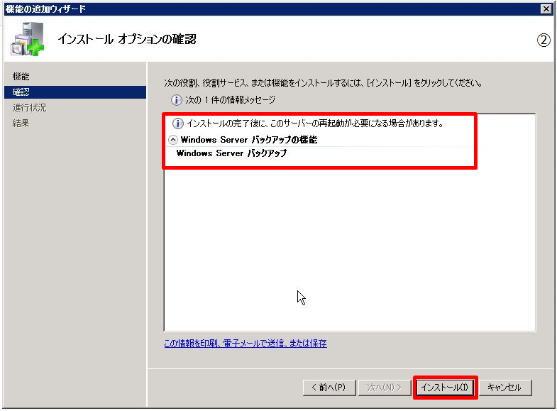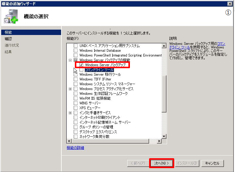 - 「Windows Server バックアップ」をチェックし、「次へ」を選択する。
