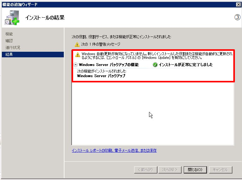 - 「インストールの結果」にて正常にインストールが完了していることを確認する。