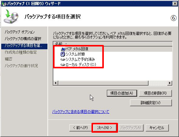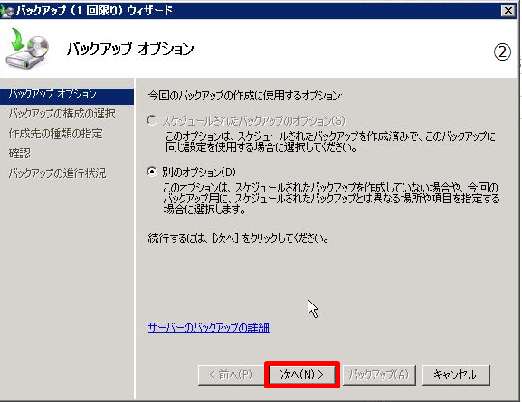 2.「バックアップオプション」にて、「次へ」を選択する。