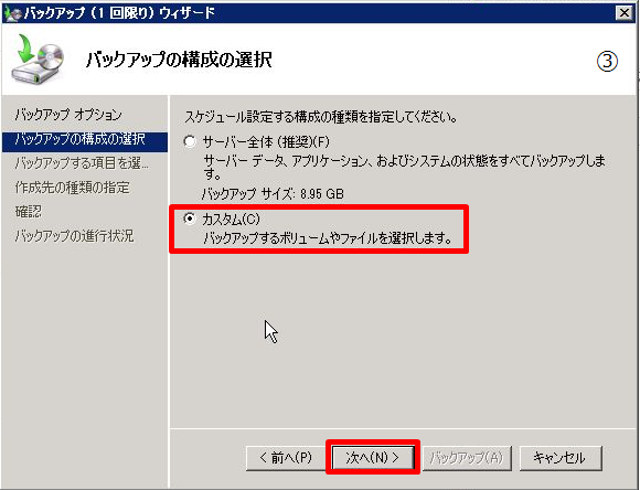 3.「バックアップの構成の選択」にて「カスタム」を選択し、「次へ」を選択する。