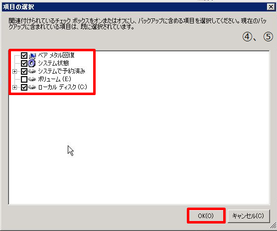 5.「項目の選択」画面が表示されるため、バックアップ対象を選択し、「OK」を選択する。