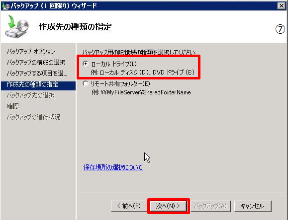 7.「作成先の種類の指定」にて「ローカルドライブ」を指定して、「次へ」を選択する。
