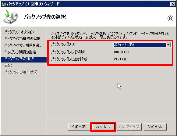 8.「バックアップ先の選択」にて、バックアップ先を指定する。