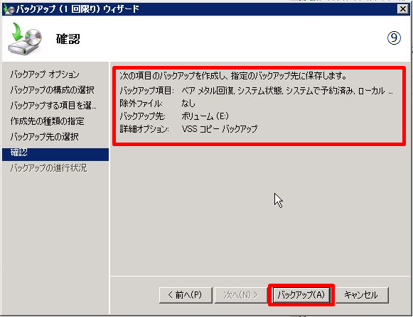 9.「確認」にて内容を確認し、「バックアップ」を選択する。