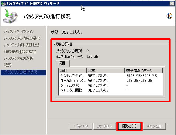 10.「バックアップの進行状況」にて全項目が完了したことを確認する。