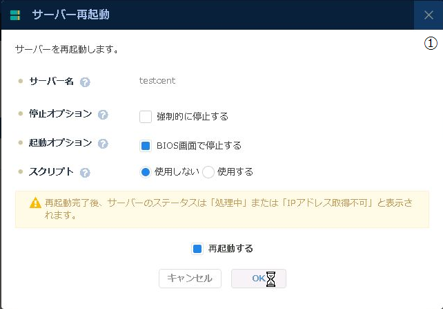 1.FJcloud-V(旧ニフクラ)コントロールパネル(以降コントロールパネル)から対象のサーバーを再起動する。その際、起動オプションにて「BIOS画面で停止する」をチェックしておく。