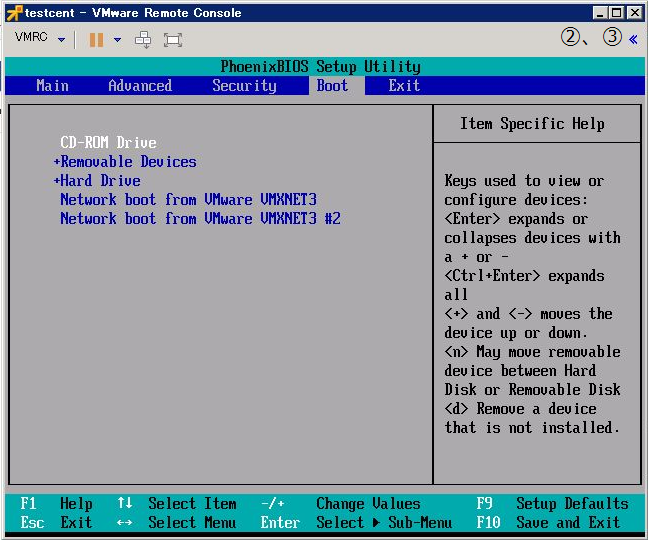 3.BIOS画面の「Boot」メニューにて「CD-ROM Drive」を一番上になるよう設定する。