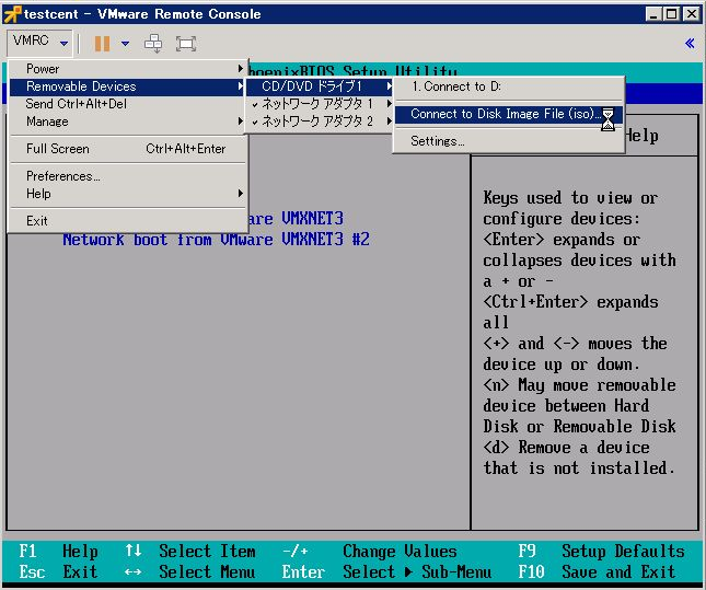 4.コンソール上部の「VMRC」を選択し、「Removable Devices」-「CD/DVD ドライブ1」-「Connect to Image File(iso)...」を選択する。エクスプローラーからマウントするOSのisoイメージを選択し、マウント処理を行う。