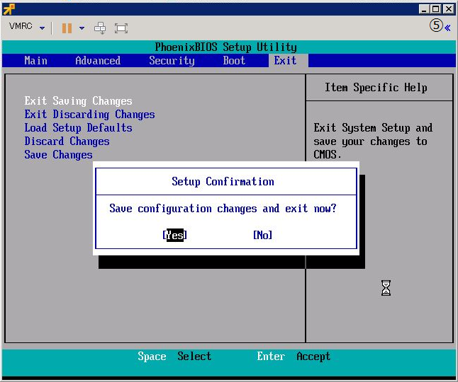 5.コンソール画面にてBIOS画面を保存して終了する。「Press any key to boot from CD or DVD」と表示されたら、何かしらのキーを入力する。