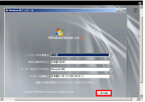 7. 「Windowsのインストール」画面が起動するので「次へ」を選択する。