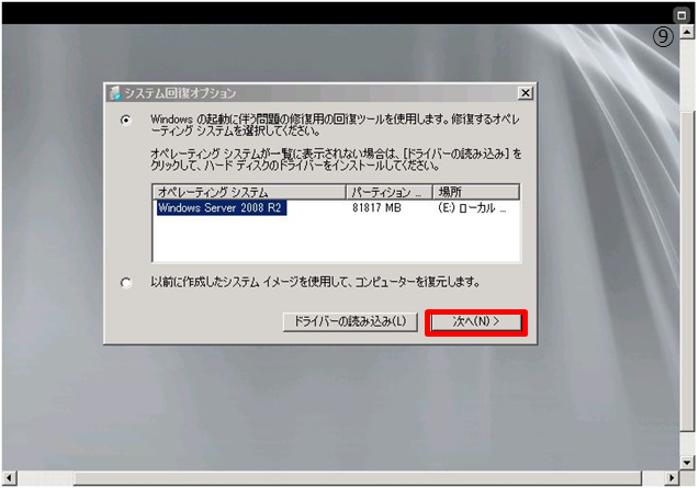 9.「システム回復オプション」にて、対象のオペレーティングシステムが表示されていることを確認し「次へ」を選択する。