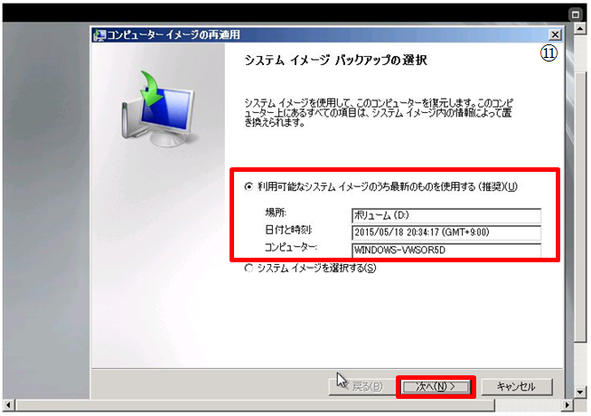 11. 取得したバックアップイメージが表示されることを確認し、「次へ」を選択する。