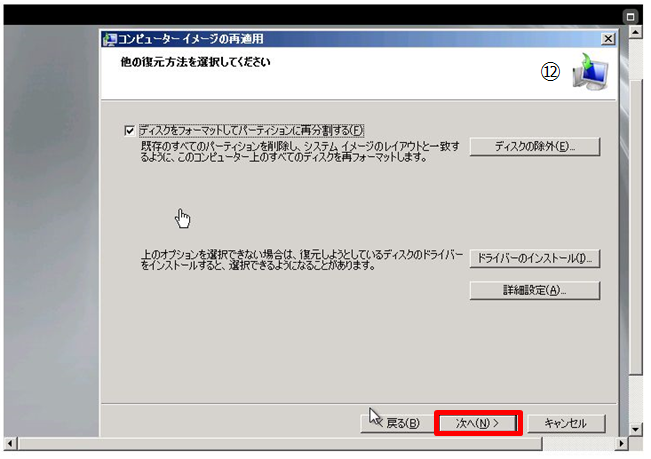 12.「ディスクをフォーマットしてパーティションに再分割する」、「ディスクの除外」を必要に応じてチェック、設定し、「次へ」を選択する。