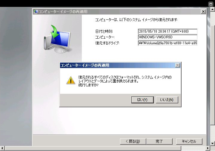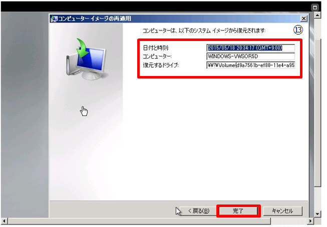 13. 復元されるイメージの日時などの情報が表示されるため確認し、「完了」を選択する。