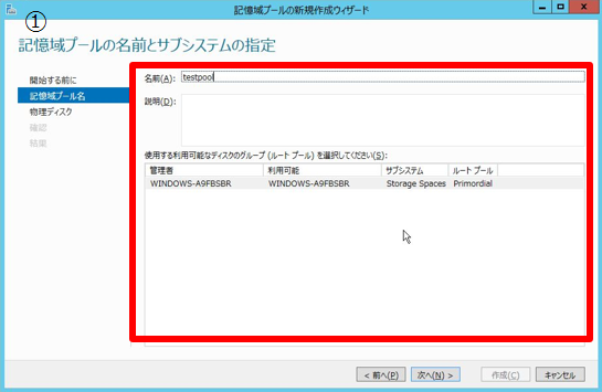 - 1. 記憶域プールの名前を入力し、ディスクのグループを選択する。