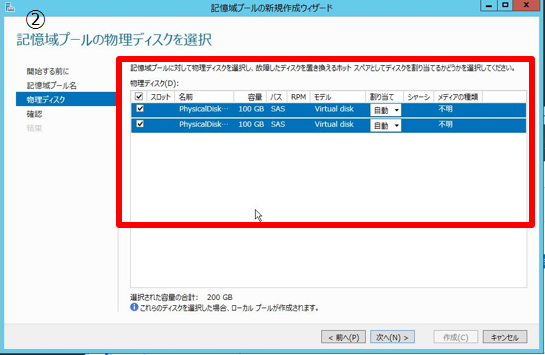 - 2. 記憶域プールに使用する物理ディスクを選択する。