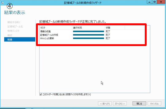 - 4. 結果を確認する。「このウィザードを閉じるときに仮想ディスクを作成します」にチェックする。