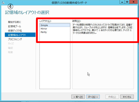 - 4. 記憶域のレイアウトを選択する。ここでは「Simple」を選択。 ★補足事項:ここではSimpleを選択しましたが、「Mirror(ミラーリング)」、「Parity(パリティ)」の冗長性/復元機能を使用することが可能です。またホットスペアを登録することも可能で、サービスの可用性を維持できます。