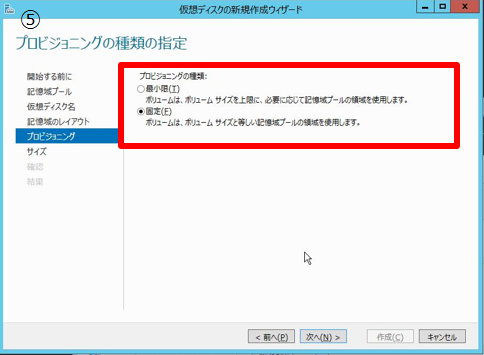 - 5. プロビジョニングの種類を選択する。★補足事項:プロビジョニングの種類の指定にて、ここでは固定(シックプロビジョニング)を選択しましたが、最小限(シン・プロビジョニング)を使用すれば、ディスクサイズを仮想化して、作成したプール容量よりも大きな容量のディスクを作成することが可能です。